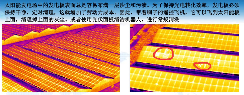 光伏板:通过结合可见光数据和红外数据,能快速便捷的检查光伏板表面有无破损、污渍,并通过红外热量信息直观的观察光伏板工作状态。