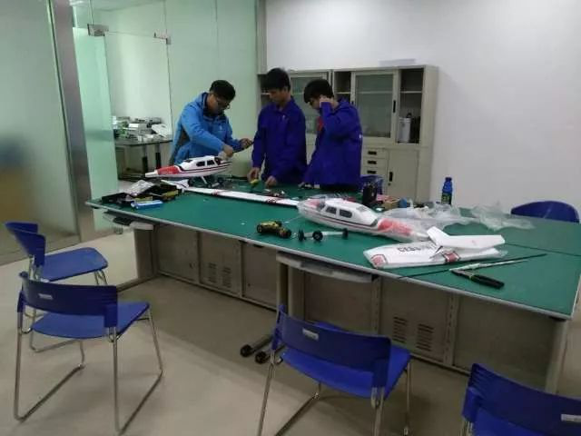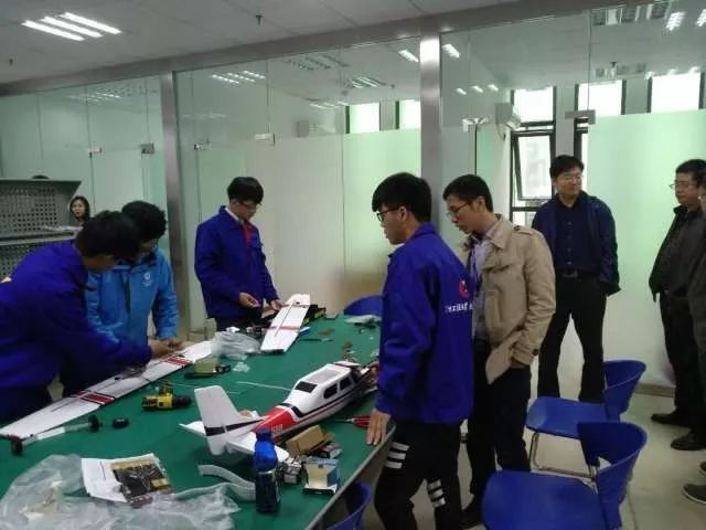 在一批代表去教室交流体验的同时,另一批代表正在我们的器材室参观浏览,当时,我们的另一位老师正在带着一批学员组装飞机,代表们在老师组装的间隙,上前和老师交流了一些他们感兴趣或不明白的地方,都获益匪浅。